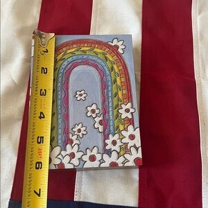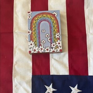 Wooden art block by Primitives by Kathy. Displayed on a Daisy field with central rainbow 🌈 🌼 Measures approximately 6 inches by 4.75 inches by 1 inch.