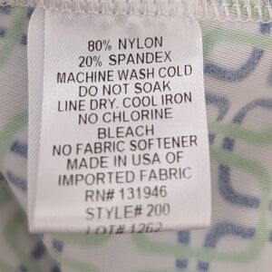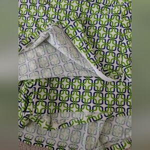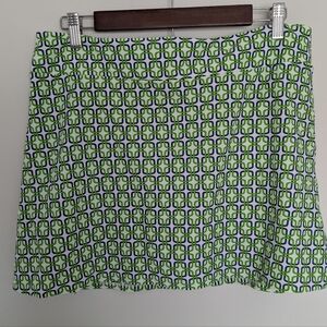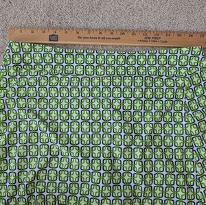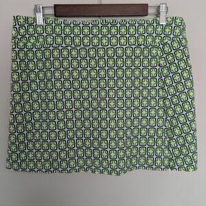 The Jude Connally Skort in size Medium features a geometric print in green, making it ideal for both casual and travel occasions. The pull-on closure and stretch material ensure a comfortable fit, while the skort style combines the functionality of a skirt with the convenience of shorts. Made from a lightweight nylon and spandex blend jersey fabric, it is machine washable and perfect for all seasons, especially spring, summer, and fall. With a zippered accent and a mid-rise waist, this skort exudes a preppy yet sporty vibe, making it a versatile and stylish addition to any woman's wardrobe.