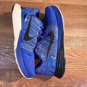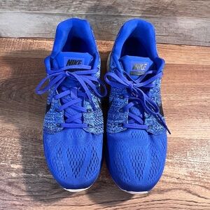 Nike Lunar running shoes in men’s size 11 featuring a bold blue knit upper with black Swoosh detail. Designed with lightweight breathability and Lunarlon cushioning for comfort and support. Great for running, gym workouts, or everyday athleisure wear.