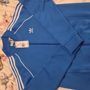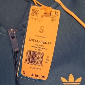Iconic blue jacket with white stripes. Features Adidas trefoil logo. SST Classic TT