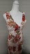 A linen dress with vibrant pink, red, and green floral pattern, a deep V-neck, and a form-fitting silhouette with a midi length.