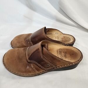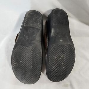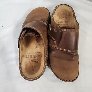 Comfortable brown leather slip-on clogs. Perfect for casual wear.