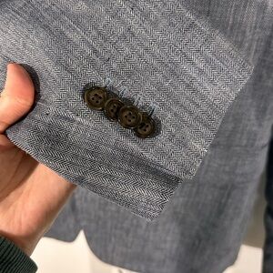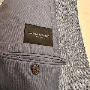 Easy, breathable, and perfect for spring–summer outfits — this Banana Republic slim-fit blazer has that softly structured, modern look. The fabric has a subtle blue herringbone texture that reads more elevated than a plain weave, and it works great with chinos, denim, or dressed up for events. Two-button front, lightweight lining, and a relaxed but tailored fit.