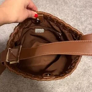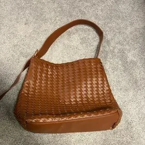 Stylish woven design. Rich brown color. Perfect for everyday use and great as a work bag. Comfortably fits a laptop, and other daily essentials. Only used once, in like-new condition. Adjustable strap with gold hardware. Has inside zipper pocket.