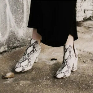 Design: Faux leather booties, snake print, almond toe, trendy dipped sides, 3.25 inch block heel