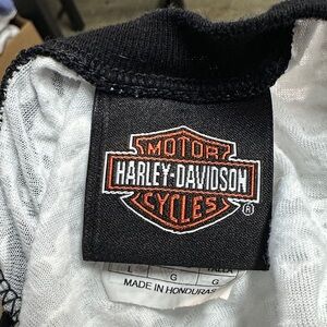 Chic Harley-Davidson tee with bold logo. White body with black sleeves. Ideal for casual wear.