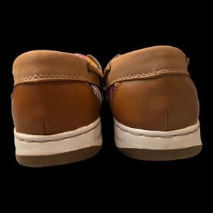 These leather boat shoes are a nice tan color and feature colorful canvas accents. These shoes are in excellent condition and are clean. There's one tiny spot on the front top of the right shoe. Please see photos for condition and reach out with any questions.