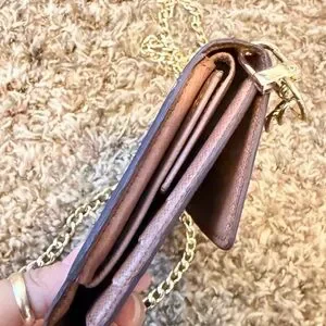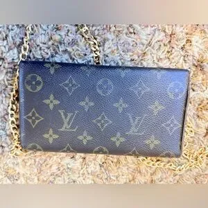 Authentic Louis Vuitton continental Wallet converted into a crossbody. Comes with non lv chain strap. It has card slots bill compartment zippered coin pocket and note compartment. The main snap button doesn’t work. Made in France in 1992. Check pictures for more details. Code mi0942. Size 7.5x4.