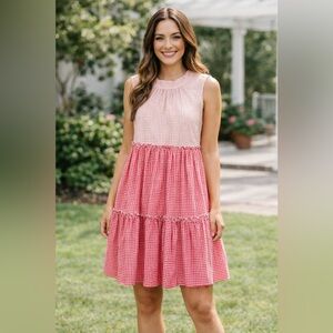 This charming pink gingham dress is perfect for any occasion. Its sleeveless design ensures comfort and style