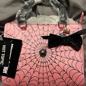 Chic Monster High shoulder bag with pink and black spiderweb design. Features a stylish bow and skull detail.