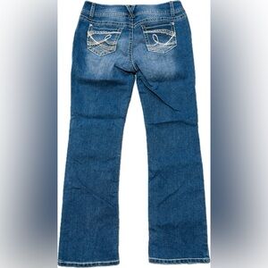 Classic bootcut style. Front and back pockets have rhinestone embellishments. Two buttons + zipper fly. Please see measurements in pics.