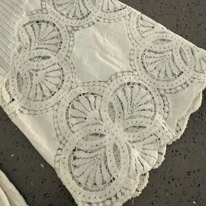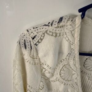 Elegant Cream button down shirt. Features intricate lace details. Flared sleeves add a stylish touch.