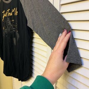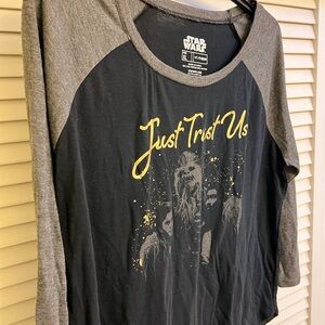 Super cute women’s Sz XL Star Wars shirt. It’s marked XL but I think it runs small. Scooped bottom and 3/4 length sleeves. Good used condition. It says Just Trust Us on it!!! I