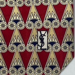 YVES SAINT LAURENT men's silk necktie showcasing a bold red base with striking gold and navy geometric motifs and iconic YSL logo detail. A classic luxury designer tie that delivers timeless European style for business, formal, or statement looks.