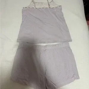 Chic and comfortable pajama set with lavender stripes. Features a sleeveless top and matching shorts. Ideal for a cozy night's sleep.