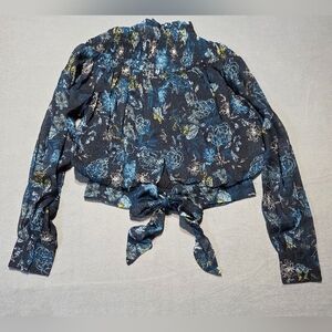 Chic navy blouse with floral design. Features long sleeves and ruffled neckline. Ideal for stylish outings.