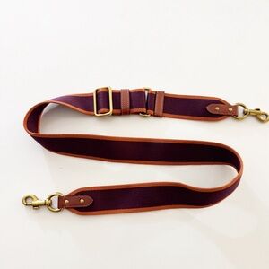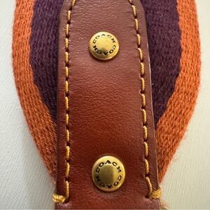 Coach webbing strap burgundy/maroon/wine color with burnt orange trim, brown leather trim and gold tone hardware. Adjustable length, approximately 48” at longest. Good used condition.