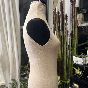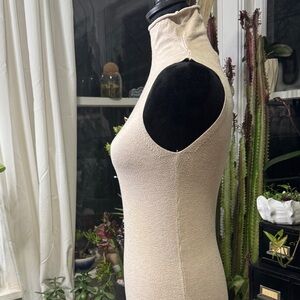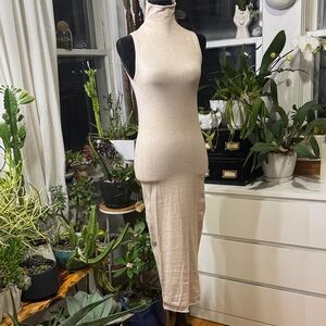 Chic sleeveless maxi dress with a turtleneck. Soft beige color. Ideal for versatile styling.