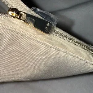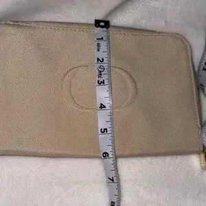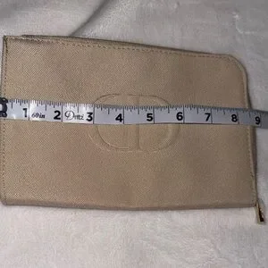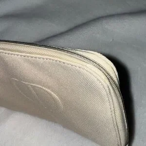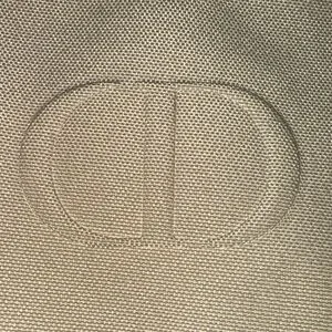 Chic Dior pouch in a subtle beige tone. Ideal for storing beauty essentials. Compact and stylish design.