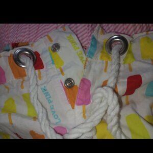 Features: Thick white rope drawstring, metal grommets/eyelets, "LOVE PINK" embroidered logo on the leg, ruffled hem.