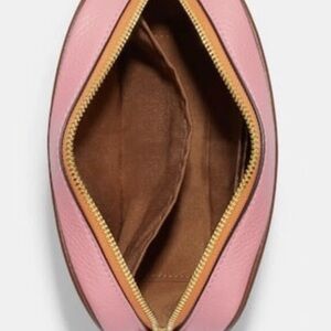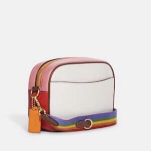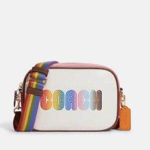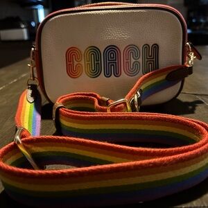 Stylish Coach bag with a colorful logo. Features a vibrant rainbow strap. Perfect for adding flair.