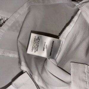 Chic white button-down with unique sleeve accents. Ideal for versatile styling.