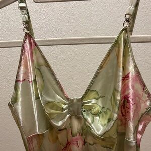 Elegant satin chemise with floral design. Features delicate straps and a soft drape. Perfect for a luxurious night's sleep.
