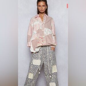 POL Pink Multi Pullover Patchwork Button Top 3/4 Sleeve Boho Oversized NWOT