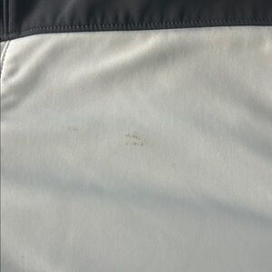 The North Face men’s size medium soft shell and fleece lined water repellent jacket. White and slate gray. Small stain of left side of chest as shown in photos.