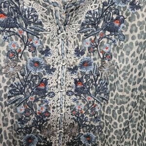 This is a Johnny Was Biya embroidered silk blouse in a blue and gray leopard print with floral embroidery. XXL