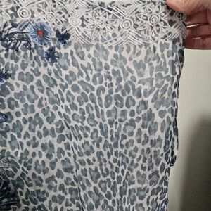 This is a Johnny Was Biya embroidered silk blouse in a blue and gray leopard XXL