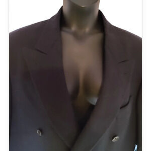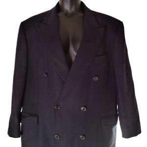 Extremely nice, Rich deep navy Blue wool coat, with Chevron knitting and rayon silky lining. Double breasted with pockets inside and out. No holes or rips, well cared for. Size 46R.
