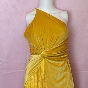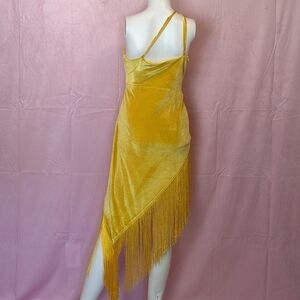 Golden Yellow Velvet One Shoulder Twist Front Fringe Hem Mini Dress size Large