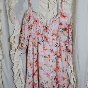 BB Dakota RSVP Tae Ruffle Tier Floral Print Maxi Dress. A floaty popover bodice and ruffled tiers enhance the ethereal silhouette of this floral-print chiffon maxi dress by BB Dakota. Adjustable straps. Tie across back.. lined to knee. Nice condition no stains or holes.