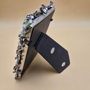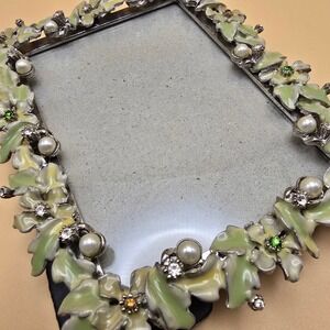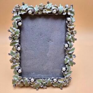 Keywords: photo frame, YOSCA frame, ornate frame, floral frame, enamel accents, pearl embellishments, rhinestone details, desktop display, silver tone, elegant decor, keepsake frame, memory display, vintage style