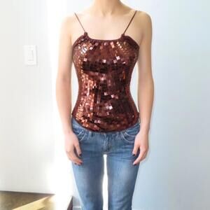 Say What bronze sequin sleeveless top size L fitted stretch fit spaghetti strap neckline all over sequin detail party y2k glam top brown bronze sparkle