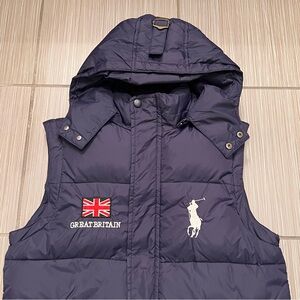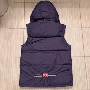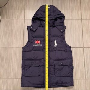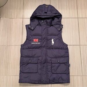 Super nice and warm, insulating Polo Ralph Lauren puffy puff navy zipper hooded vest with logo and Great Britain details and Union Jack flag