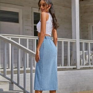 Elevate your wardrobe with this chic blue denim skirt. Perfect for any occasion, this skirt offers a flattering fit and a stylish slit for added flair. No stretch 15 waist and about 32 inches long