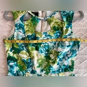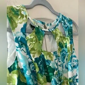 EUC excellent condition & quality! Minimal sticker residue on zipper (see photo). Chic floral midi dress by AGB. Features vibrant blue and green hues. Perfect for any occasion. Neckline cut outs offer a unique design. Polyester & spandex blend. Sleeveless. Measurements in photos. Smoke free home. Women’s size 4