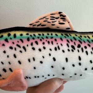 It is a realistic replica of a rainbow trout and is part of a collection of plush animals modeled after various critters.