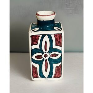 The Handpainted Firenze Ceramic Vase is a beautifully crafted piece of Italian pottery featuring a unique multi-color design. The vase, in the shape of a jar, originates from Italy, adding an authentic touch to any collection or decor. Its handpainted details make it a standout piece for collectors of modern Italian ceramics, showcasing the craftsmanship and artistic flair of Firenze. Perfect for displaying flowers or as a decorative accent, this vase is sure to add a touch of elegance to any space. There is a small chip on the bottom as shown in the pictures. The vase is 6.5” tall and 3” square base.