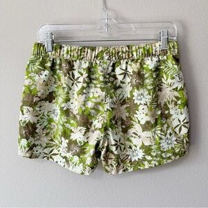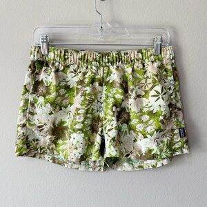 Patagonia Barely Baggies in green tropical botanical print. Size medium. 2 1/2" inseam. Elastic waistband with drawstring. Pockets. Midrise. Pre-owned, excellent condition- writing on interior care tag.