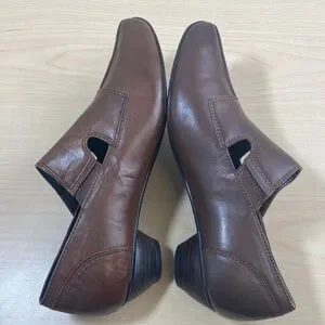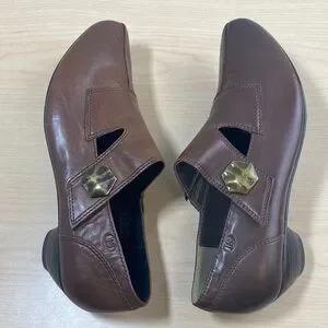 Elegant brown ankle booties with a unique Velcro strap design with brass tone button. Comfortable and stylish for everyday wear.