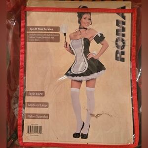 one piece dress with arm puffs, had peace and feather duster. stockings and Petticoat not included. .