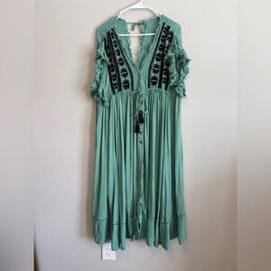 Chic teal midi dress with black embroidered details. Flowy and stylish design. Tassels rope tie at waist and in back, frayed hemline. Taylor cotton material midi length. EUC