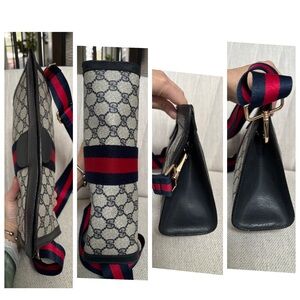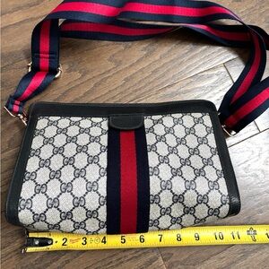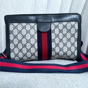 This is a preloved *verified* authentic GUCCI GG Navy Stripe Monogram Crossbody Clutch paired with a removable offmarket strap. Serial # & logp in photos. Exterior leather dyed and sealed with protectant. Can be used as crossbody or clutch. All working hardware (eg button, zippers). Minor imperfections exist (ie scratches, discolorations, fading, bends, stains, cracks) - minor discolorations possible. discoloration. Comes with non-Gucci storage bag. Nonsmoking home.