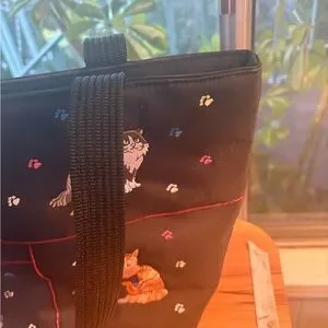 Chic and stylish black tote bag featuring adorable embroidered cat designs. Perfect for cat lovers and fashion enthusiasts alike.