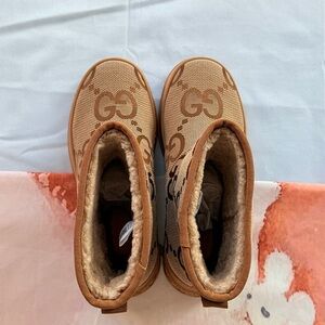 Light brown and dark brown ankle boots with the classic Gucci double G monogram pattern on the upper.