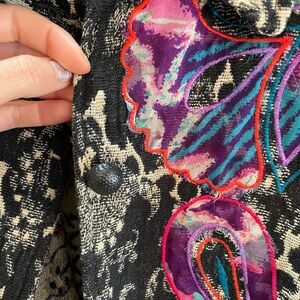 Epic pattern with pops of color in the front. Thicker tapestry fabric. Well made, unique buttons. Artsy teacher vibes. Size M. Pit 18” sleeves 23”. No flaws.