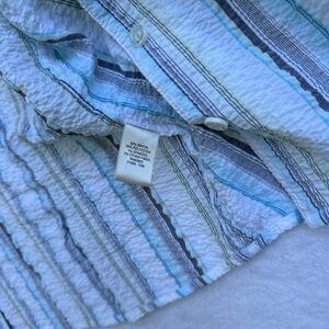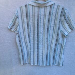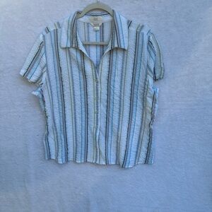 Chic blue striped shirt with button-down front. Short sleeves and classic collar. Ideal for casual or office wear.